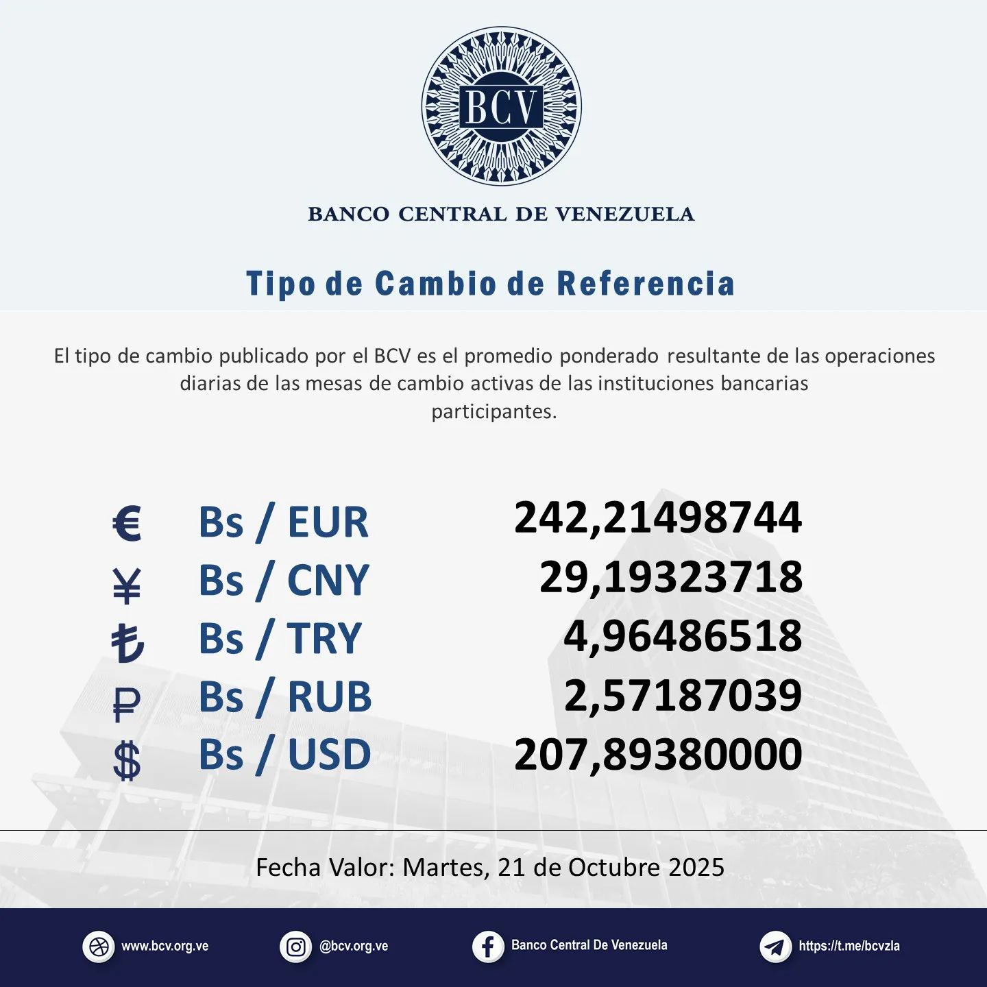 El Banco Central de Venezuela informó que las mesas de cambio de ayer arrojaron un promedio de 207,89 bolívares por dólar. Recuerda que esta es la única tasa válida para cualquier transacción del día de hoy.