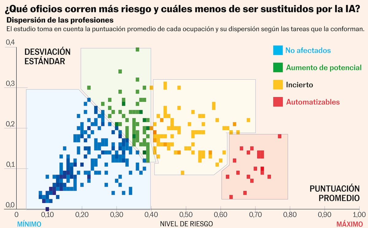 En enero de 2024, Kristalina Georgieva, directora gerente del Fondo Monetario Internacional, firmó un artículo en el que decía que el 40% de los empleos del mundo se verían afectados por la IA, en algunos casos, serían sustituidos, en otros, complementados. En agosto de 2023, la Organización Internacional del Trabajo publicó un análisis sobre qué empleos corrían más riesgo de ser automatizados y cuáles menos. Su análisis se realizó antes de la eclosión de los agentes IA y ya identificaban un 5% de oficios automatizables por completo en un momento en el que la IA estaba en una fase incipiente y los agentes eran algo más propio de la ciencia ficción que de la realidad.