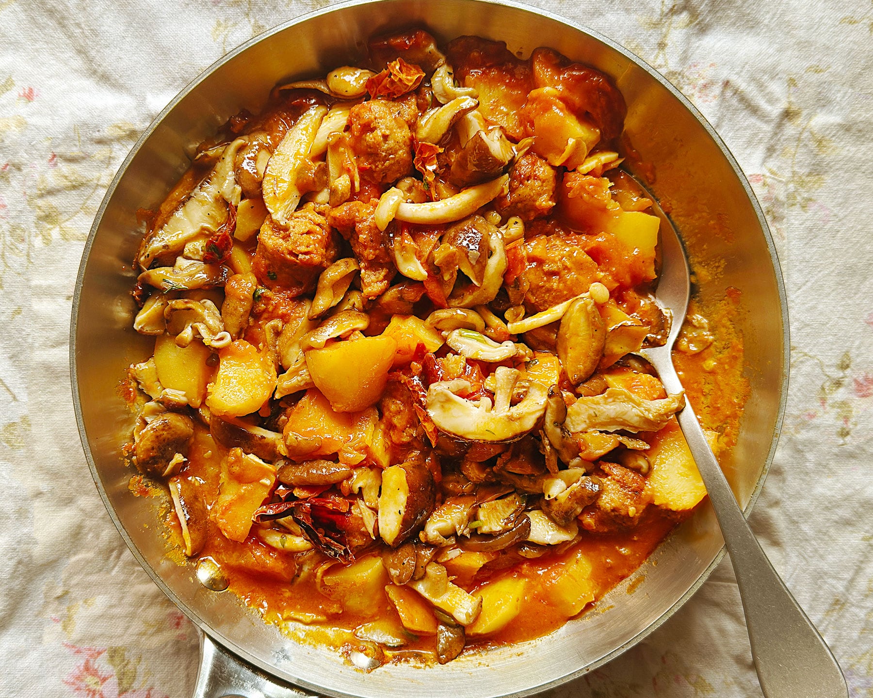Cuando estén tiernas las patatas y el líquido espesito, devolver las setas a la sartén y mezclar. Probar la sazón y rectificar si hiciera falta. Servir calentito.