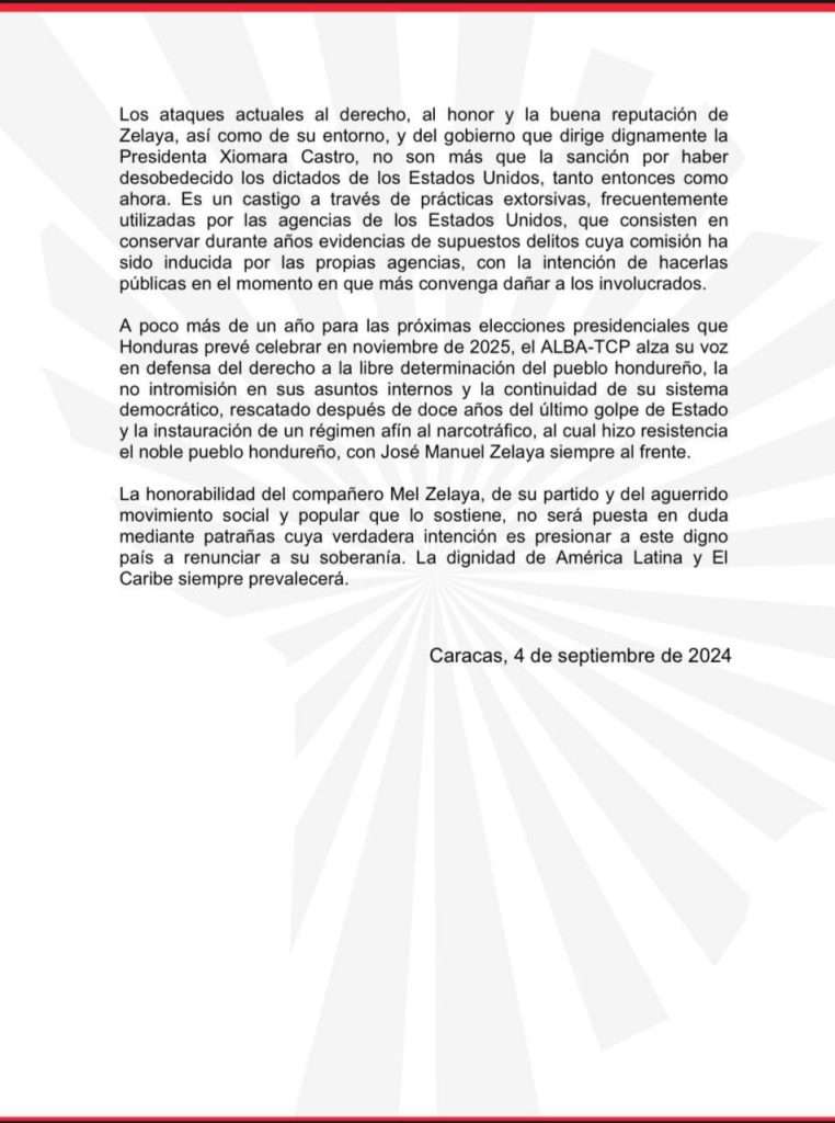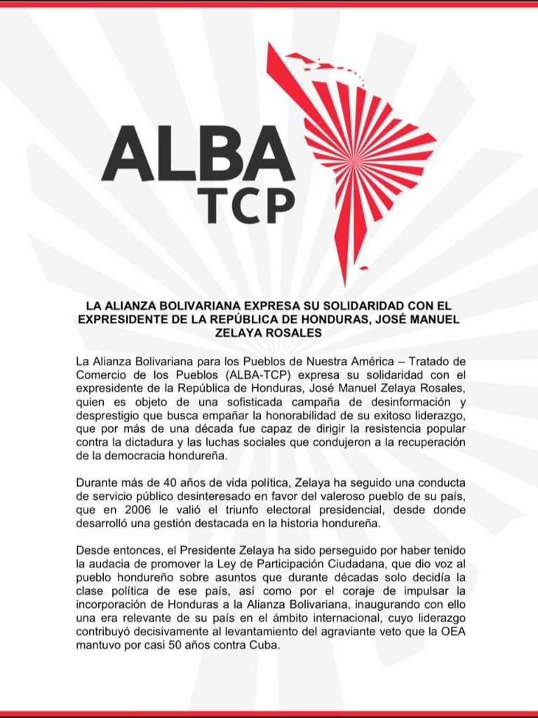 La Alianza Bolivariana para los Pueblos de Nuestra América Tratado de Comercio de los Pueblos (ALBA-TCP) expresa su solidaridad con el expresidente de la República de Honduras, José Manuel Zelaya Rosales, quien es objeto de una sofisticada campaña de desinformación y desprestigio que busca empañar la honorabilidad de su exitoso liderazgo, que por más de una década fue capaz de dirigir la resistencia popular contra la dictadura y las luchas sociales que condujeron a la recuperación de la democracia hondureña.