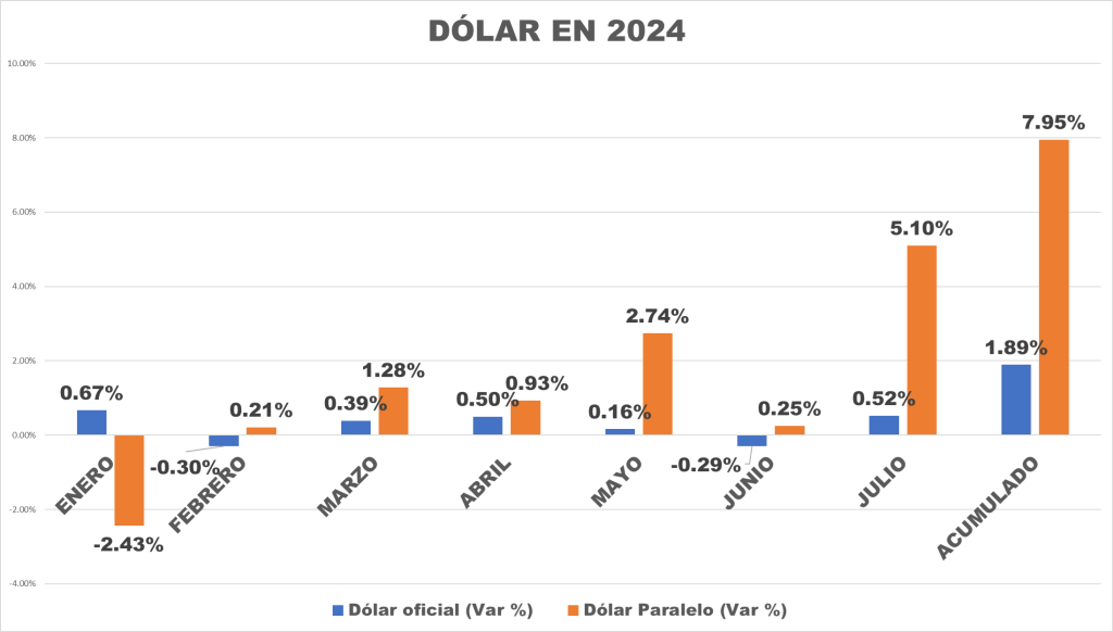 Así las cosas, en los siete meses transcurridos de 2024, el precio del dólar oficial apenas ha subido 1,89%, mientras el mercado paralelo reporta un alza de 7,95%, de manera que en términos relativos el precio no oficial ha subido 320,6% más que el reportado por el BCV.