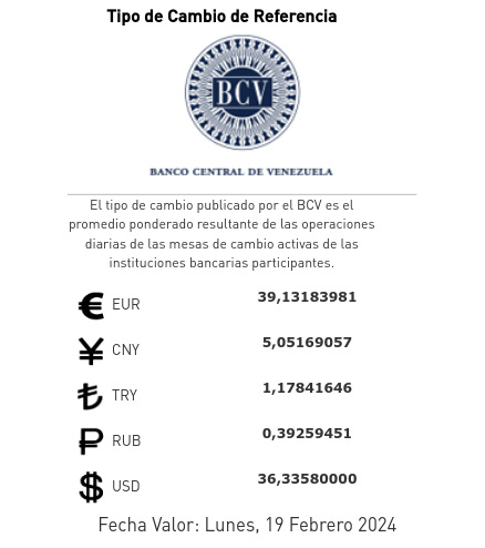 Al cierre de la jornada de este viernes 16 de febrero de 2024, el dólar estadounidense se cotizó en 36,33 bolívares, informó el Banco Central de Venezuela en sus redes sociales.