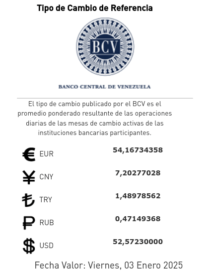 Al cierre de la jornada de este jueves 2 de enero de 2025, el dólar estadounidense se cotizó en 52,57 bolívares, informó el Banco Central de Venezuela en sus redes sociales.