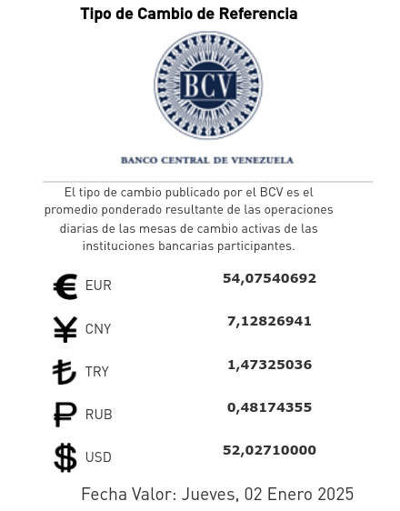 Al cierre de la jornada de este lunes 30 de diciembre de 2024, el dólar estadounidense se cotizó en 52,02 bolívares, informó el Banco Central de Venezuela en sus redes sociales.