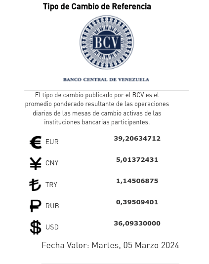 Al cierre de la jornada de este lunes 4 de marzo de 2024, el dólar estadounidense se cotizó en 36,09 bolívares, informó el Banco Central de Venezuela en sus redes sociales.