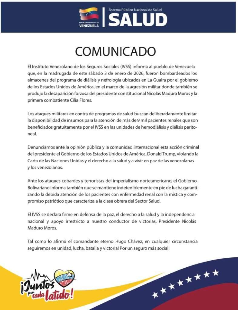 El Instituto Venezolano de los Seguros Sociales (IVSS) informó que en la madrugada de este sábado fueron bombardeados los almacenes del programa de diálisis y nefrología ubicados en La Guaira, en el marco de la ofensiva militar atribuida al gobierno de Estados Unidos.