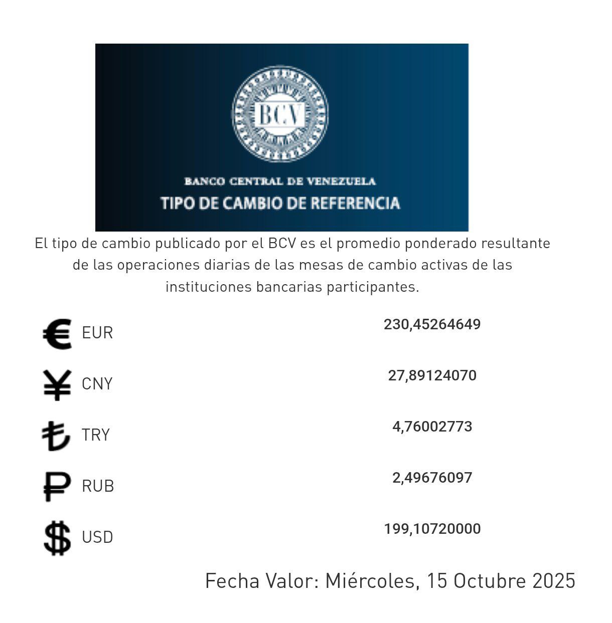El Banco Central de Venezuela (BCV) publicó el tipo de cambio oficial que regirá las operaciones en el país para este miércoles 15 de octubre de 2025.
