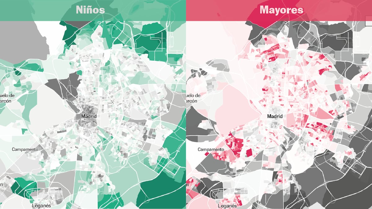 Dentro de la capital, el mapa refleja una brecha: los barrios con muchos niños y aquellos con muchos mayores están en zonas diferentes de la ciudad.