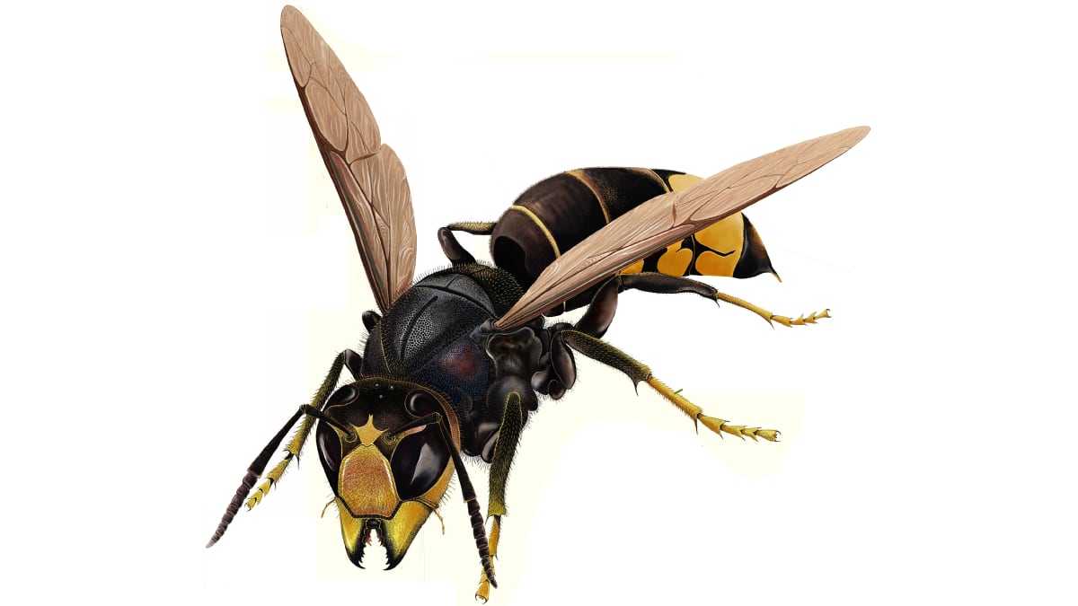 Para distinguir una avispa asiática, lo primero en lo que hay que fijarse es en el tamaño del insecto. Una obrera de esta especie invasora es casi el doble de grande que una avispa común, tipo Vespula germanica.
