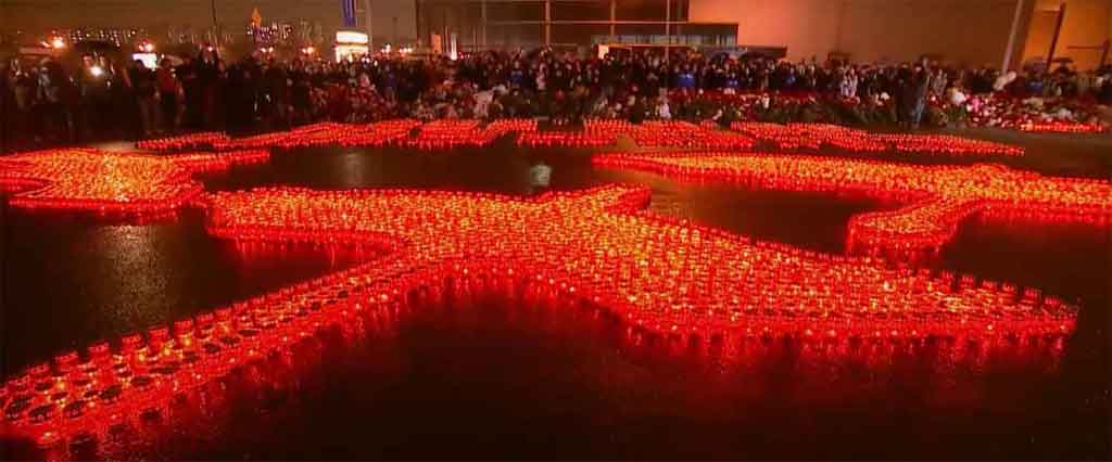 El espectáculo de una interminable fila de grullas alza su vuelo desde los cimientos del edificio, donde los moscovitas han colocado miles de flores, velas encendidas y peluches, y se elevan hacia el cielo en memoria de los caídos en el lugar.