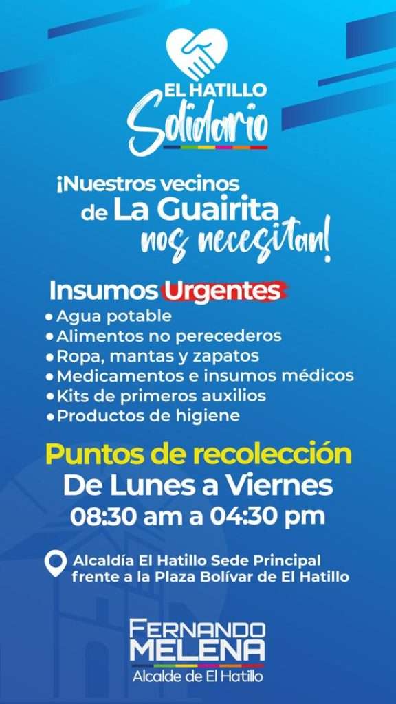 La Alcaldía de El Hatillo, será sede de un centro de acopio, para recolectar insumos de primera necesidad para los vecinos de La Toma, que perdieron sus viviendas.