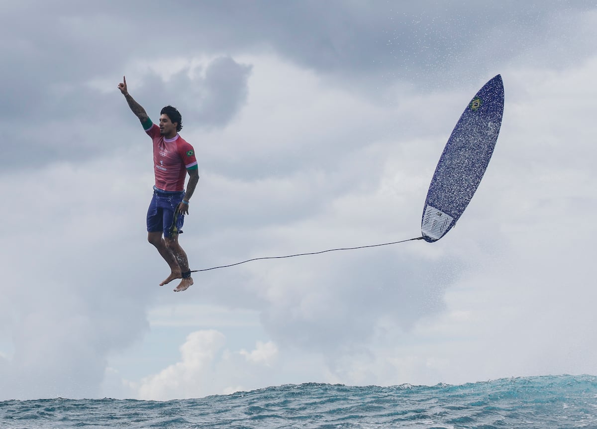 Después de un modesto estreno olímpico en Tokio 2020, el surf ha encontrado en París 2024 todo aquello que pretendía. Ha tenido que viajar a más de 15.000 kilómetros de la capital francesa para dejar huella, pero cuando todavía no ha llegado la lucha por las medallas ya ha dejado una de las fotos de estos Juegos Olímpicos. Gabriel Medina (30 años, São Sebastião; Brasil), referente de la disciplina, vuela por encima del océano pacífico y señala con el dedo el cielo después de protagonizar la mejor ola de la breve historia olímpica de la disciplina, puntuada con un 9,9 sobre 10. Su tabla, su nexo con el agua, flota en el aire junto a él en una estampa con aires divinos que acredita también el mérito de Jerome Brouillet, fotógrafo de la agencia francesa AFP.