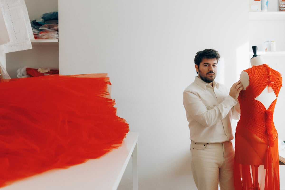 En cualquier caso, en sus comienzos contó con la generosidad de mucha gente. Amigas que él llama prescriptoras, influencers con miles de seguidores que le encargaron los primeros vestidos. La piedra empezó a rodar. “Vendí desde el minuto uno porque ya era conocido en el sector y tenía amigos. Siempre lo digo en mis charlas en las universidades: no os comparéis conmigo porque para mí fue mucho más fácil. Luego nos tocó la pandemia en nuestra primera temporada primavera-verano y fue duro”. En sus primeros Goya vistió a Candela Peña, Paula Usero y Marta Etura, pero fue su primer desfile lo que le cambió la vida. “Hasta entonces yo era ‘el bloguero’, o ‘el estilista de’ o ‘el ayudante de’, y no es que me molestara porque yo el ego lo tengo muy controlado, sé lo que hago y conozco el valor de mi trabajo, pero de alguna manera ese desfile sirvió para que mucha gente viera que había montado una empresa seria y se dejara de decir que yo tenía un hobby que me habían montado mis padres, como muchas veces escuché y leí; o que yo compraba aquí y allá los vestidos… A mí eso me molestaba porque yo trabajaba mucho”. Y aún sigue trabajando. Llega cada día al taller a las ocho de la mañana y sale pasadas las siete de la tarde. “Llevo todos los departamentos. Puedes preguntarme lo que cuesta la caja de un envío, el número del envío y la etiqueta de la alarma. Te los recito de memoria. También me sé los salarios de cada uno de mis empleados y llevo yo mismo las redes sociales. Me gustaría delegar, pero para eso se necesita tiempo y presupuesto”, admite. Los años de micromanaging lo han dejado agotado. “Trabajo todo el día y duermo poco. No me sienta bien la comida, me duele todo el cuerpo, voy al fisio todas las semanas. No sé si esta vida estresada era lo que yo quería. Lo único que me relaja es quedar a desayunar con amigos y hablar. Hablar sin parar, porque si voy al gimnasio (que no me gusta especialmente) sigo pensando en mis cosas”.