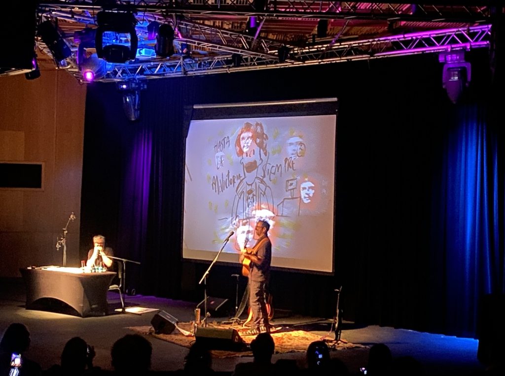 Encantador, anecdótico y divertido. El íntimo performance del argentino-estadounidense fue, sin dudas, más de lo esperado pese a lo sencillo del escenario. Una alfombra decoraba la tarima, mientras dos luces iluminaban al artista y a su acompañante, el caricaturista Liners.