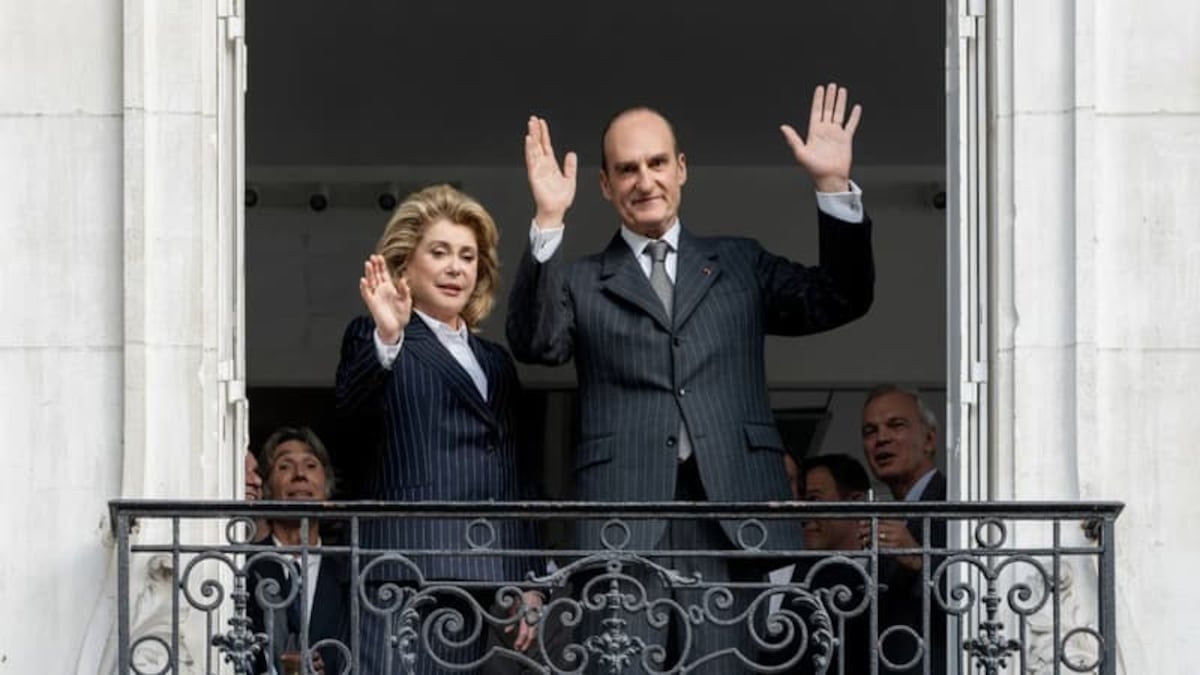 Otro símbolo francés, Catherine Deneuve, es la encargada de dar vida a Bernadette Chodron de Courcel, llamada Chirac tras su matrimonio, actual viuda del expresidente a sus 91 años, y, según detalla con sorna esta ficción “ligeramente inspirada” en la realidad, ninguneada por el círculo del poder ya desde el primoroso gag con el que se inicia la película. Chirac, que ya había sido primer ministro en dos mandatos y alcalde de París durante ocho años, es elegido presidente de la República a mediados de mayo de 1995. Con sus espigados 1,89 centímetros de estatura y subido a un pedestal saluda desde un balcón a sus seguidores, con la pequeña barandilla casi a la altura de sus rodillas. Su esposa, a la que nadie hace ni caso, se acerca a cámara lenta hacia el griterío y los olores del triunfo. Domenach, con buen criterio, utiliza imágenes reales de la televisión de la época para ilustrar a la enfervorizada ciudadanía. Pero cuando llega al balcón, minimizada física, sentimental y políticamente, su marido, con expresivos brazos abiertos de incredulidad, le incrusta una frase trapera: “¿Qué haces aquí, Bernadette? ¡Que te vas a caer!”.