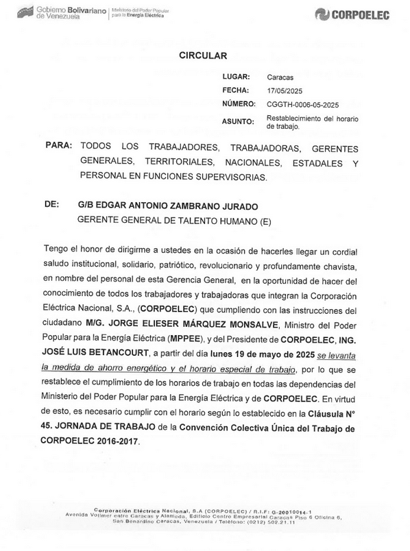 Mediante una circular, el Ministerio del Poder Popular para la Energía Eléctrica informó que «se levanta la medida de ahorro energético y el horario especial de trabajo», implementada desde el pasado mes de marzo.