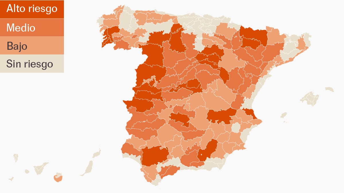 Este [[dia]] hay [[alto_riesgo_muni]] municipios en zonas con riesgo alto por calor ([[perc_riesgo_alto_muni]]%), [[riesgo_medio_muni]] en riesgo medio ([[perc_riesgo_medio_muni]]%) y [[bajo_riesgo_muni]] en riesgo bajo ([[perc_bajo_riesgo_muni]]%). Consulte en el mapa las zonas donde el calor alcanzará niveles peligrosos para la salud, según los datos del Ministerio de Sanidad y Aemet.