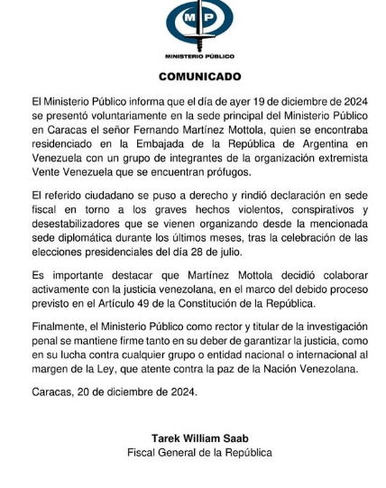 Este viernes, el Ministerio Público (MP) confirmó que el dirigente opositor argentino, Fernando Martínez Mottola, quien se encontraba residenciado en la embajada de Argentina en Venezuela, se presentó de forma voluntaria ante la sede principal del organismo, en la ciudad de Caracas.