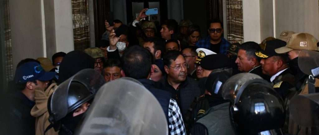 El presidente Luis Arce se encuentra al interior de la sede del Órgano Ejecutivo en La Paz. “Repliegue todas esas fuerzas que tiene ahí afuera”, le ordenó Arce a Zuñiga rodeado de otras autoridades y en presencia de los uniformados, que acompañaban a Arce, refiere Unitel.bol