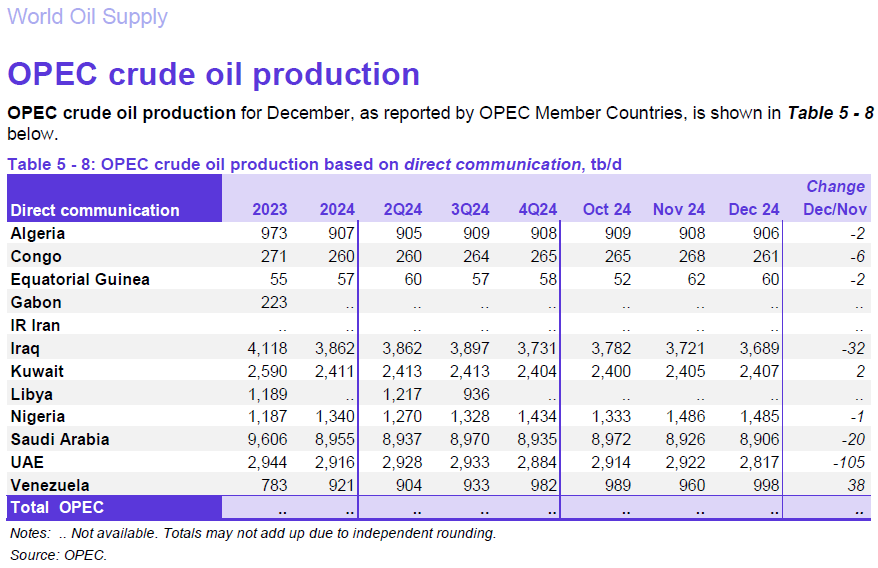 Asimismo, señala que los 22 países que integran la alianza OPEP+ redujeron la producción de petróleo en 64.000 barriles por día (bpd) en diciembre de 2024 y estaban produciendo 284.000 bpd por debajo del objetivo con la consideración de recortes voluntarios y compensaciones.
