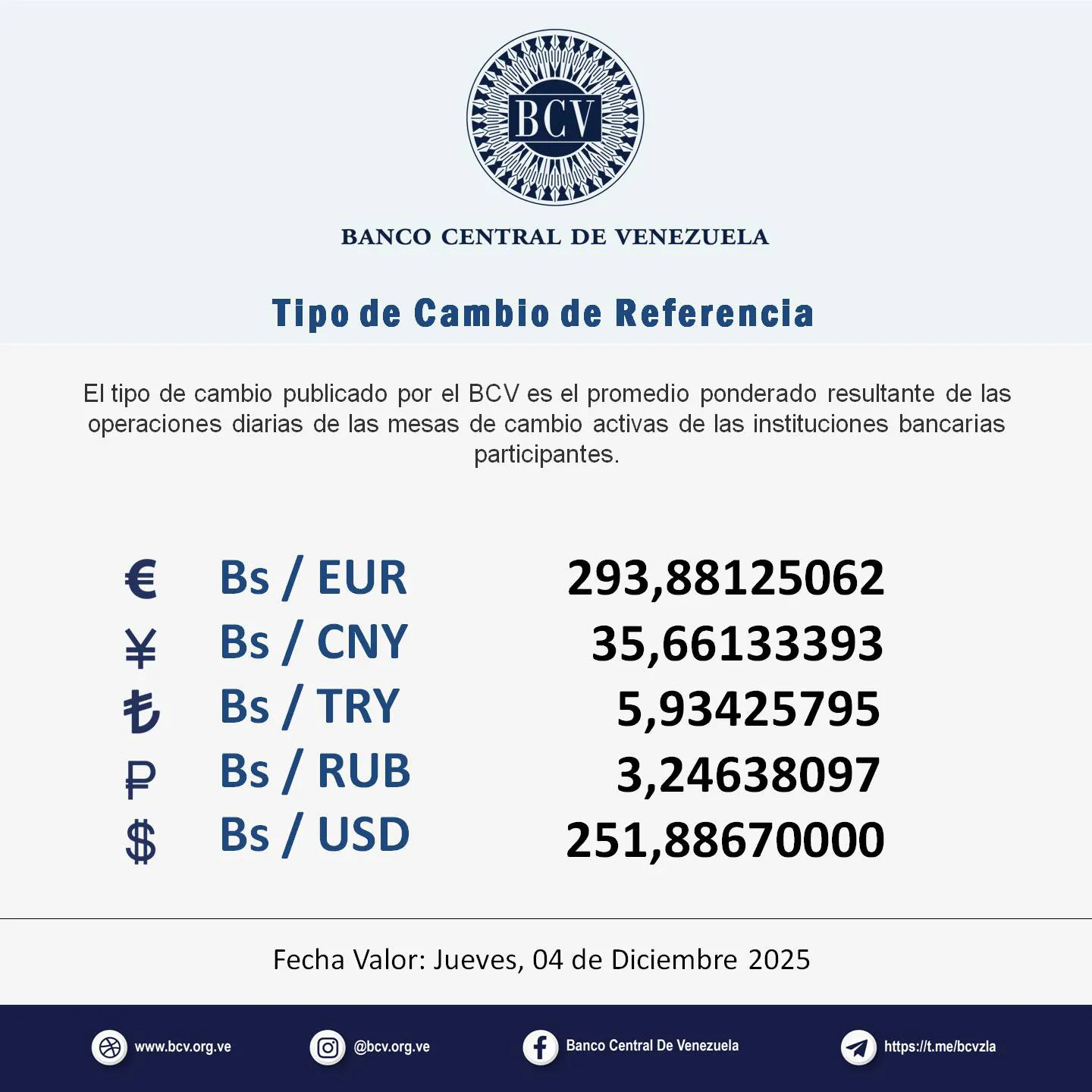 El Banco Central de Venezuela informó que las mesas de cambio de ayer arrojaron un promedio de 251,88 bolívares por dólar. Recuerda que esta es la única tasa válida para cualquier transacción del día de hoy.