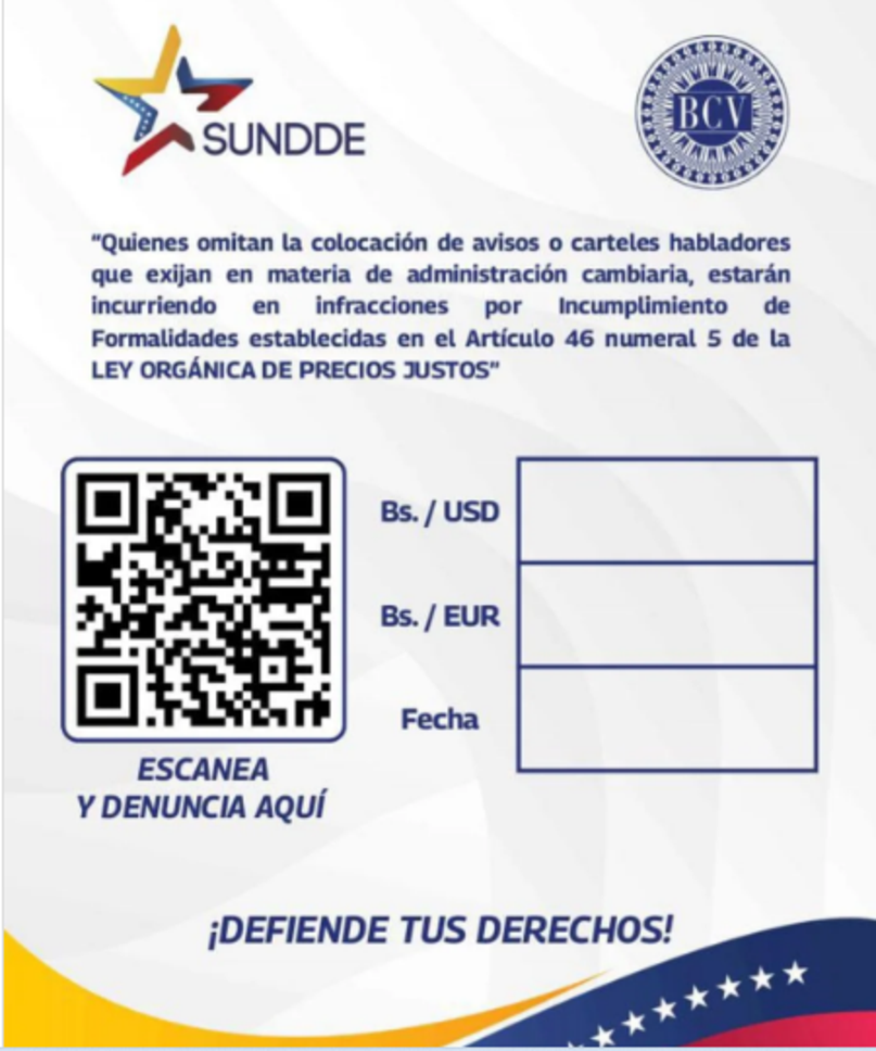 La Superintendencia Nacional para la Defensa de los Derechos Socioeconómicos (Sundde) aprobó un nuevo formato oficial para la publicación de la tasa del Banco Central de Venezuela (BCV), el cual deberán exponer obligatoriamente todos los comercios del país.