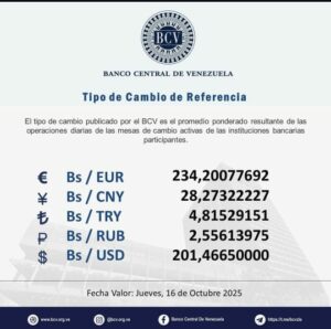El tipo de cambio oficial para todas las transacciones monetarias se ubicará, este jueves 16 de octubre, en 201,46 bolívares por dólar, según el reporte diario del Banco Central de Venezuela (BCV).
