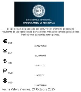 El dólar oficial del Banco Central de Venezuela (BCV) cierra la jornada en 214,41 bolívares, valor cambiario para este viernes 24 de octubre.
