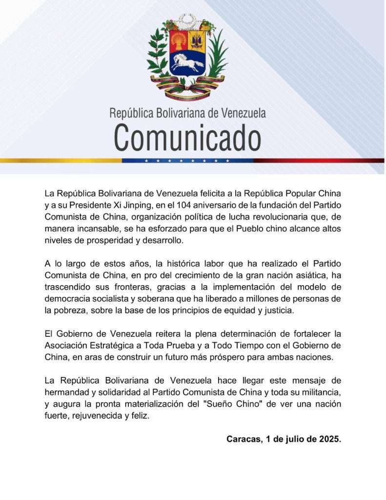 La República Bolivariana de Venezuela felicita a la República Popular China y a su Presidente Xi Jinping, en ocasión de conmemorarse el 104 aniversario de la fundación del Partido Comunista de China, organización política de lucha revolucionaria que, de manera incansable, se ha esforzado para que el Pueblo chino alcance altos estándares de prosperidad y desarrollo.